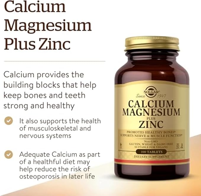Solgar Calcium Magnesium Plus Zinc là viên uống bổ sung 3 khoáng chất thiết yếu – Canxi, Magie và Kẽm – giúp xương và răng chắc khỏe, duy trì sức mạnh cơ bắp, giảm nguy cơ loãng xương và hỗ trợ tăng cường hệ miễn dịch. Sản phẩm còn giúp cải thiện giấc ngủ, giảm căng thẳng lo âu, phòng ngừa tụt canxi máu, chuột rút, và góp phần duy trì sự cân bằng khoáng chất trong cơ thể. Với công thức tối ưu, Solgar mang đến giải pháp toàn diện cho sức khỏe xương khớp và hệ thần kinh.