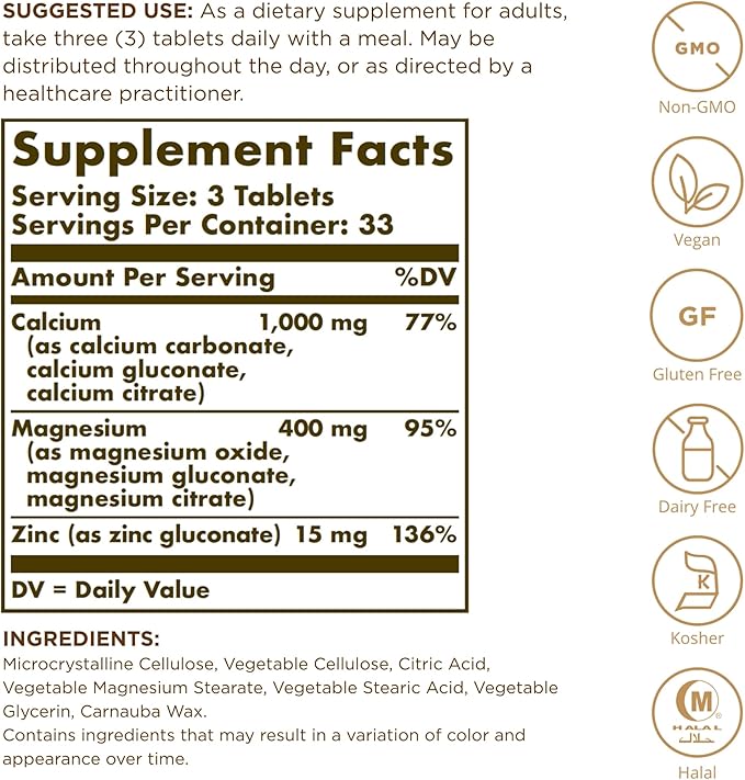 Mỗi viên Solgar Calcium Magnesium Plus Zinc cung cấp: