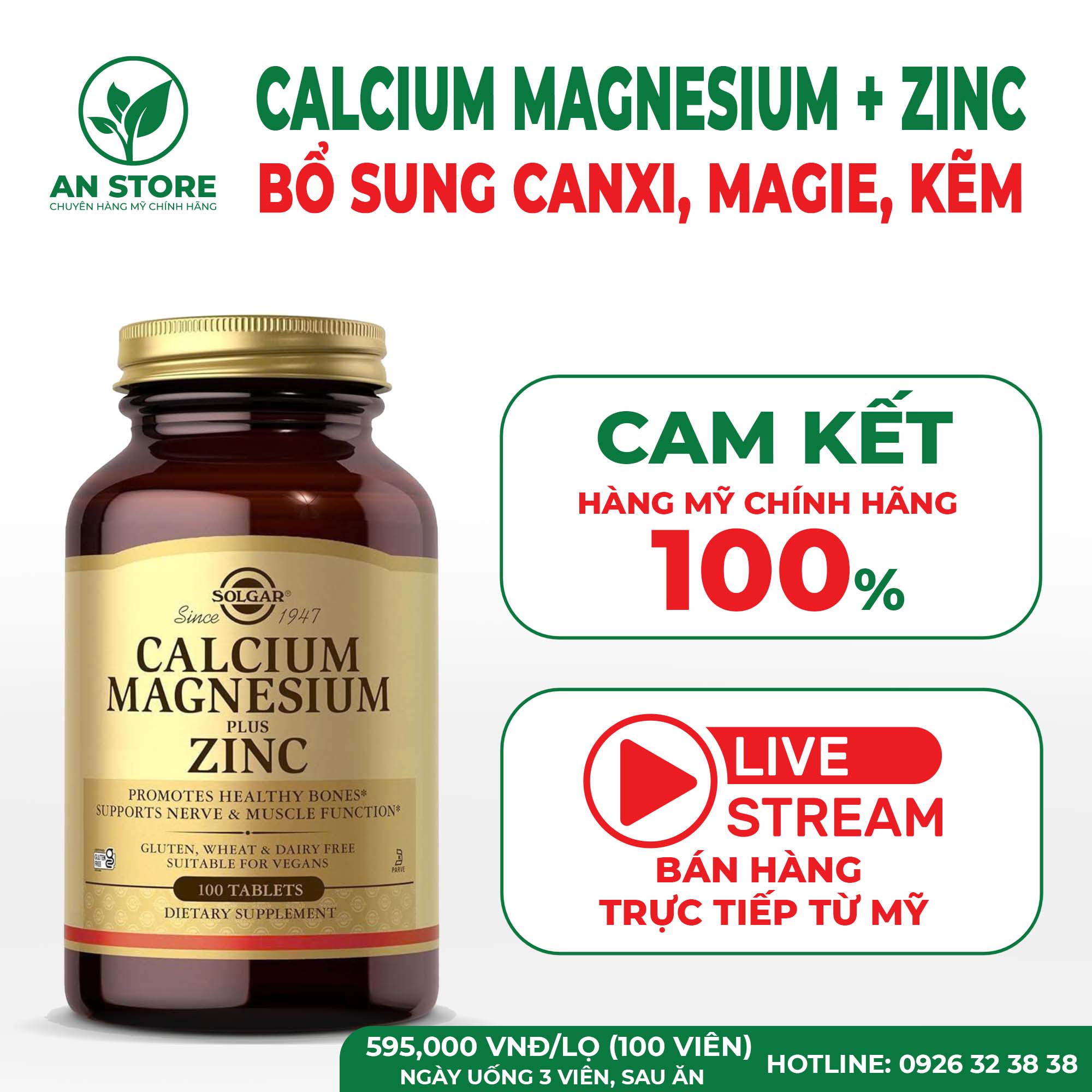 An Store tự hào là địa chỉ cung cấp viên uống Solgar Calcium Magnesium Plus Zinc chuẩn nội địa Mỹ 100%. Chủ shop An Store hiện đang sinh sống và làm việc tại Mỹ, thường xuyên thực hiện các buổi livestream bán hàng và nhập hàng trực tiếp từ các hãng dược danh tiếng, các chuỗi siêu thị lớn, uy tín hàng đầu như Costco, Walmart.