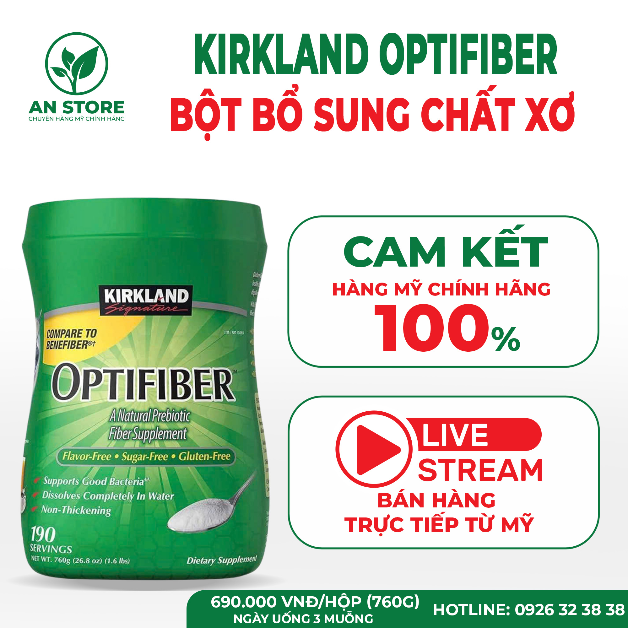 An Store cam kết chỉ cung cấp Bột Bổ Sung Chất Xơ Kirkland Optifiber Của Mỹ, chuẩn nội địa Mỹ 100%. Chủ shop sống ở Mỹ, live stream bán hàng và nhập hàng trực tiếp từ Mỹ, đảm bảo chất lượng và nguồn gốc sản phẩm.