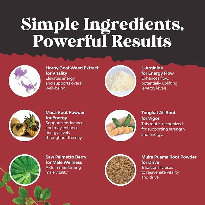 Horny Goat Weed (Dâm Dương Hoắc): Đây là thành phần chính và nổi bật nhất, được biết đến rộng rãi trong y học cổ truyền châu Á với khả năng tăng cường ham muốn tình dục, cải thiện chức năng cương dương và tăng cường sinh lực. Horny Goat Weed chứa hoạt chất Icariin, giúp tăng cường sản xuất nitric oxide, làm giãn mạch máu và tăng lưu lượng máu đến dương vật, từ đó cải thiện khả năng cương cứng.