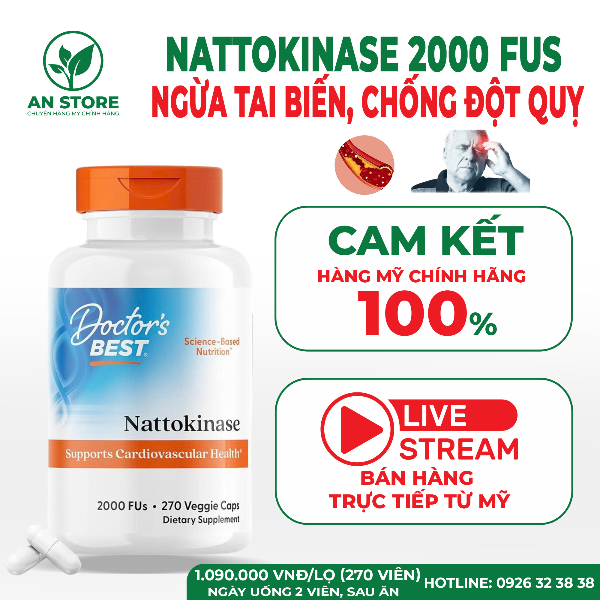 An Store khẳng định: Viên uống ngừa tai biến đột quỵ Doctor’s Best Nattokinase 2000 FUs do chúng tôi cung cấp là hàng Mỹ chính hãng, chuẩn nội địa Mỹ 100%, đã được kiểm chứng hiệu quả rõ rệt trong việc: